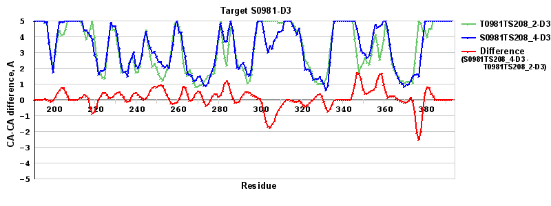 Red line = (blue line) - (green thick line): difference between the corresponding "Assisted Model"-Target and "Regular Model"-Target CA-CA distances (see above). Negative values show regions where the "assisted" model has better fit to the target than the reference model, i.e. areas of potential improvement.