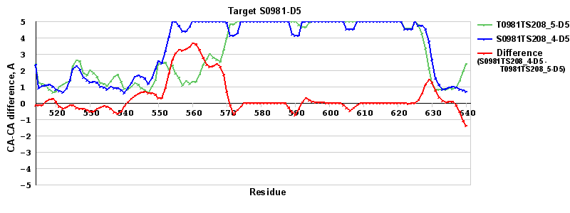 | Red line = (blue line) - (green thick line): difference between the corresponding "Assisted Model"-Target and "Regular Model"-Target CA-CA distances (see above). Negative values show regions where the "assisted" model has better fit to the target than the reference model, i.e. areas of potential improvement. |