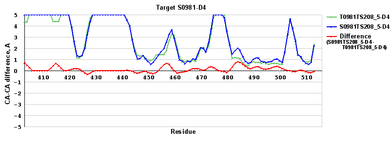 Red line = (blue line) - (green thick line): difference between the corresponding "Assisted Model"-Target and "Regular Model"-Target CA-CA distances (see above). Negative values show regions where the "assisted" model has better fit to the target than the reference model, i.e. areas of potential improvement.