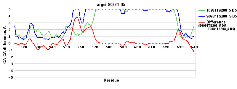 Red line = (blue line) - (green thick line): difference between the corresponding "Assisted Model"-Target and "Regular Model"-Target CA-CA distances (see above). Negative values show regions where the "assisted" model has better fit to the target than the reference model, i.e. areas of potential improvement.