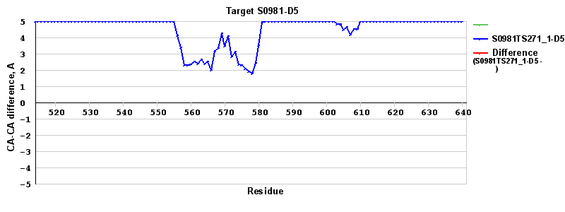 | Red line = (blue line) - (green thick line): difference between the corresponding "Assisted Model"-Target and "Regular Model"-Target CA-CA distances (see above). Negative values show regions where the "assisted" model has better fit to the target than the reference model, i.e. areas of potential improvement. |