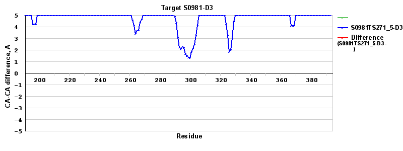 | Red line = (blue line) - (green thick line): difference between the corresponding "Assisted Model"-Target and "Regular Model"-Target CA-CA distances (see above). Negative values show regions where the "assisted" model has better fit to the target than the reference model, i.e. areas of potential improvement. |