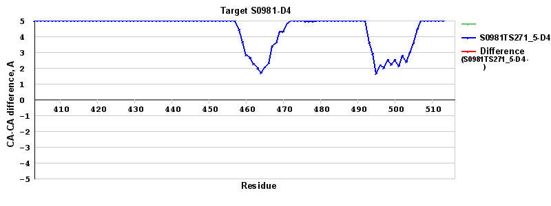 | Red line = (blue line) - (green thick line): difference between the corresponding "Assisted Model"-Target and "Regular Model"-Target CA-CA distances (see above). Negative values show regions where the "assisted" model has better fit to the target than the reference model, i.e. areas of potential improvement. |