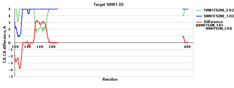 | Red line = (blue line) - (green thick line): difference between the corresponding "Assisted Model"-Target and "Regular Model"-Target CA-CA distances (see above). Negative values show regions where the "assisted" model has better fit to the target than the reference model, i.e. areas of potential improvement. |