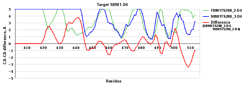 | Red line = (blue line) - (green thick line): difference between the corresponding "Assisted Model"-Target and "Regular Model"-Target CA-CA distances (see above). Negative values show regions where the "assisted" model has better fit to the target than the reference model, i.e. areas of potential improvement. |
