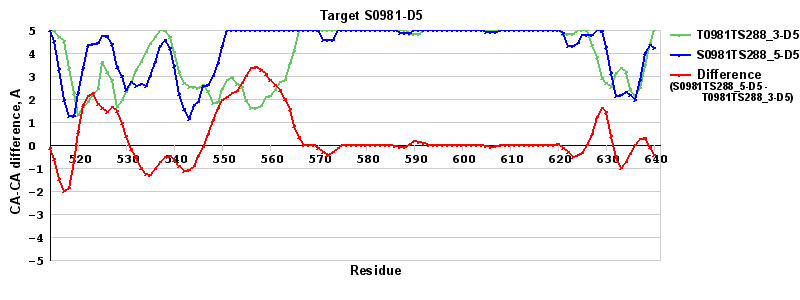 | Red line = (blue line) - (green thick line): difference between the corresponding "Assisted Model"-Target and "Regular Model"-Target CA-CA distances (see above). Negative values show regions where the "assisted" model has better fit to the target than the reference model, i.e. areas of potential improvement. |