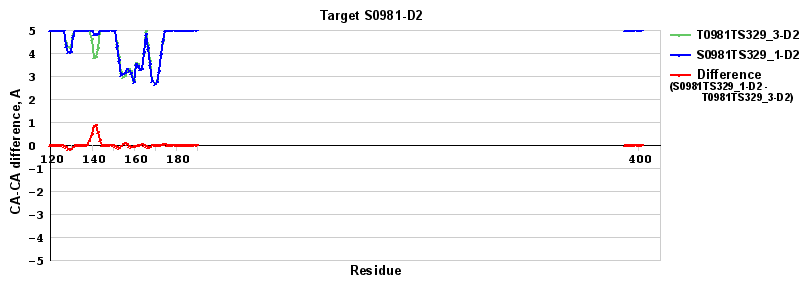 | Red line = (blue line) - (green thick line): difference between the corresponding "Assisted Model"-Target and "Regular Model"-Target CA-CA distances (see above). Negative values show regions where the "assisted" model has better fit to the target than the reference model, i.e. areas of potential improvement. |