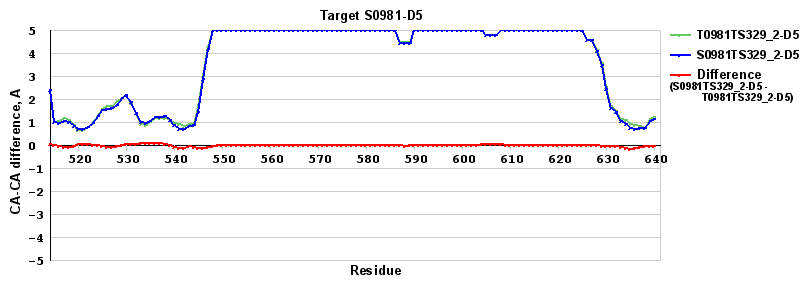 | Red line = (blue line) - (green thick line): difference between the corresponding "Assisted Model"-Target and "Regular Model"-Target CA-CA distances (see above). Negative values show regions where the "assisted" model has better fit to the target than the reference model, i.e. areas of potential improvement. |
