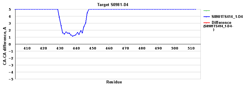 Red line = (blue line) - (green thick line): difference between the corresponding "Assisted Model"-Target and "Regular Model"-Target CA-CA distances (see above). Negative values show regions where the "assisted" model has better fit to the target than the reference model, i.e. areas of potential improvement.