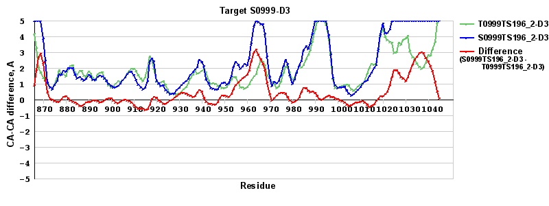 Red line = (blue line) - (green thick line): difference between the corresponding "Assisted Model"-Target and "Regular Model"-Target CA-CA distances (see above). Negative values show regions where the "assisted" model has better fit to the target than the reference model, i.e. areas of potential improvement.