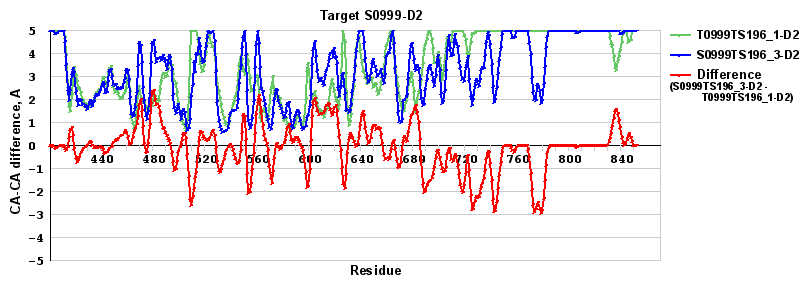 Red line = (blue line) - (green thick line): difference between the corresponding "Assisted Model"-Target and "Regular Model"-Target CA-CA distances (see above). Negative values show regions where the "assisted" model has better fit to the target than the reference model, i.e. areas of potential improvement.
