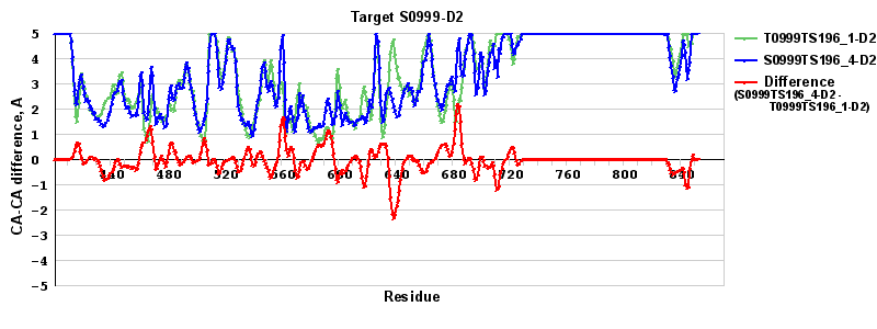 Red line = (blue line) - (green thick line): difference between the corresponding "Assisted Model"-Target and "Regular Model"-Target CA-CA distances (see above). Negative values show regions where the "assisted" model has better fit to the target than the reference model, i.e. areas of potential improvement.