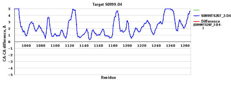 | Red line = (blue line) - (green thick line): difference between the corresponding "Assisted Model"-Target and "Regular Model"-Target CA-CA distances (see above). Negative values show regions where the "assisted" model has better fit to the target than the reference model, i.e. areas of potential improvement. |