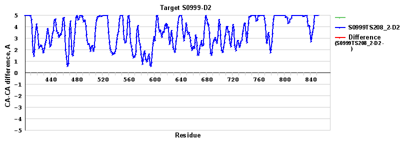 | Red line = (blue line) - (green thick line): difference between the corresponding "Assisted Model"-Target and "Regular Model"-Target CA-CA distances (see above). Negative values show regions where the "assisted" model has better fit to the target than the reference model, i.e. areas of potential improvement. |