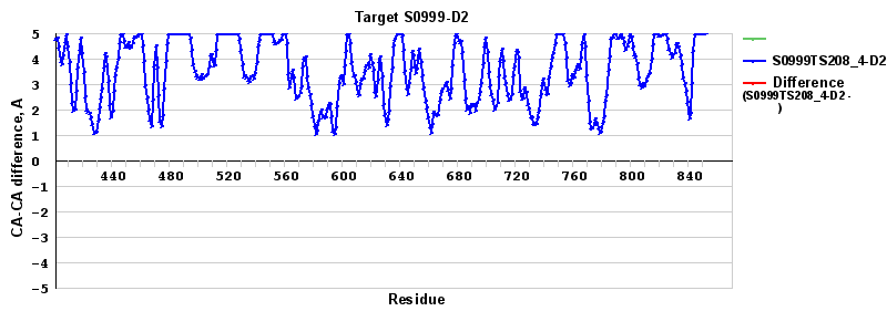 | Blue line: distance between the corresponding CA atoms in a "assisted model" and the experimental structure in the LGA sequence-independent superposition under the 4A distance cutoff. |