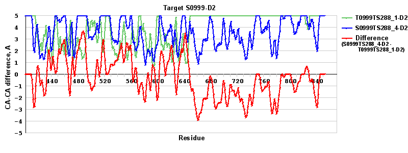 | Red line = (blue line) - (green thick line): difference between the corresponding "Assisted Model"-Target and "Regular Model"-Target CA-CA distances (see above). Negative values show regions where the "assisted" model has better fit to the target than the reference model, i.e. areas of potential improvement. |
