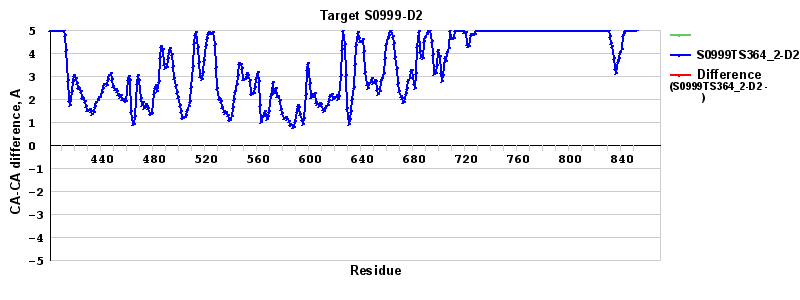 | Red line = (blue line) - (green thick line): difference between the corresponding "Assisted Model"-Target and "Regular Model"-Target CA-CA distances (see above). Negative values show regions where the "assisted" model has better fit to the target than the reference model, i.e. areas of potential improvement. |