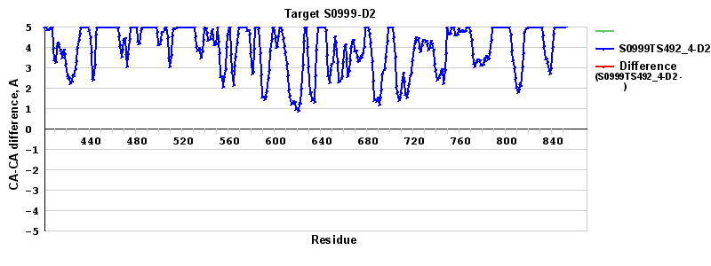 | Red line = (blue line) - (green thick line): difference between the corresponding "Assisted Model"-Target and "Regular Model"-Target CA-CA distances (see above). Negative values show regions where the "assisted" model has better fit to the target than the reference model, i.e. areas of potential improvement. |