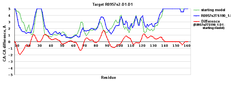 | Red line = (blue line) - (green thick line): difference between the corresponding Refined Model-Target and Starting Model-Target CA-CA distances (see above). Negative values show regions where the reifned model has better fit to the target than the starting model, i.e. areas of potential improvement. |