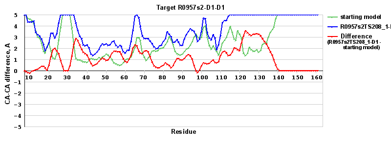 | Red line = (blue line) - (green thick line): difference between the corresponding Refined Model-Target and Starting Model-Target CA-CA distances (see above). Negative values show regions where the reifned model has better fit to the target than the starting model, i.e. areas of potential improvement. |