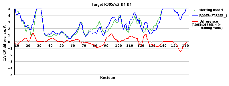 | Red line = (blue line) - (green thick line): difference between the corresponding Refined Model-Target and Starting Model-Target CA-CA distances (see above). Negative values show regions where the reifned model has better fit to the target than the starting model, i.e. areas of potential improvement. |
