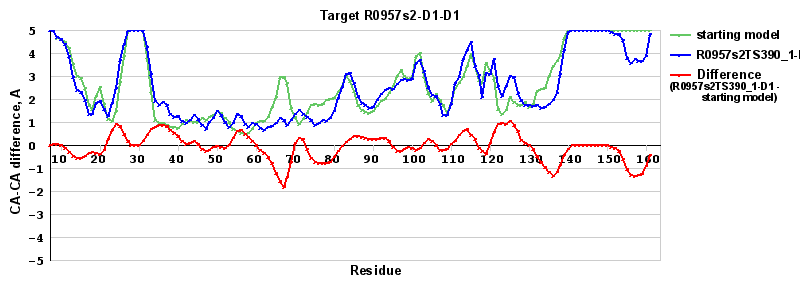 | Red line = (blue line) - (green thick line): difference between the corresponding Refined Model-Target and Starting Model-Target CA-CA distances (see above). Negative values show regions where the reifned model has better fit to the target than the starting model, i.e. areas of potential improvement. |