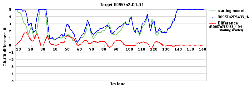 | Red line = (blue line) - (green thick line): difference between the corresponding Refined Model-Target and Starting Model-Target CA-CA distances (see above). Negative values show regions where the reifned model has better fit to the target than the starting model, i.e. areas of potential improvement. |