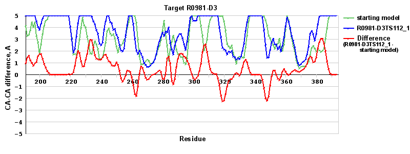 | Red line = (blue line) - (green thick line): difference between the corresponding Refined Model-Target and Starting Model-Target CA-CA distances (see above). Negative values show regions where the reifned model has better fit to the target than the starting model, i.e. areas of potential improvement. |