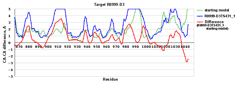 | Red line = (blue line) - (green thick line): difference between the corresponding Refined Model-Target and Starting Model-Target CA-CA distances (see above). Negative values show regions where the reifned model has better fit to the target than the starting model, i.e. areas of potential improvement. |