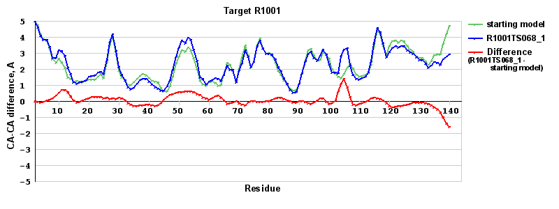| Red line = (blue line) - (green thick line): difference between the corresponding Refined Model-Target and Starting Model-Target CA-CA distances (see above). Negative values show regions where the reifned model has better fit to the target than the starting model, i.e. areas of potential improvement. |