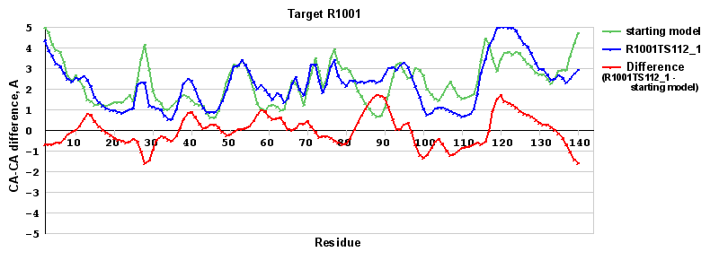 | Red line = (blue line) - (green thick line): difference between the corresponding Refined Model-Target and Starting Model-Target CA-CA distances (see above). Negative values show regions where the reifned model has better fit to the target than the starting model, i.e. areas of potential improvement. |