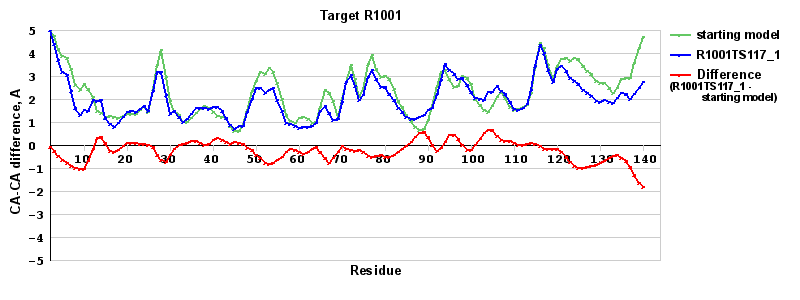 | Red line = (blue line) - (green thick line): difference between the corresponding Refined Model-Target and Starting Model-Target CA-CA distances (see above). Negative values show regions where the reifned model has better fit to the target than the starting model, i.e. areas of potential improvement. |