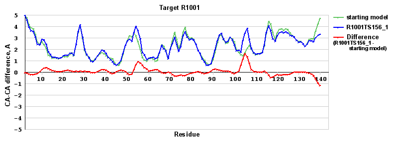 | Red line = (blue line) - (green thick line): difference between the corresponding Refined Model-Target and Starting Model-Target CA-CA distances (see above). Negative values show regions where the reifned model has better fit to the target than the starting model, i.e. areas of potential improvement. |