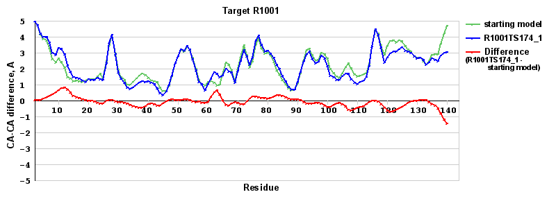 | Red line = (blue line) - (green thick line): difference between the corresponding Refined Model-Target and Starting Model-Target CA-CA distances (see above). Negative values show regions where the reifned model has better fit to the target than the starting model, i.e. areas of potential improvement. |