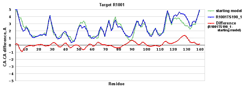 | Red line = (blue line) - (green thick line): difference between the corresponding Refined Model-Target and Starting Model-Target CA-CA distances (see above). Negative values show regions where the reifned model has better fit to the target than the starting model, i.e. areas of potential improvement. |