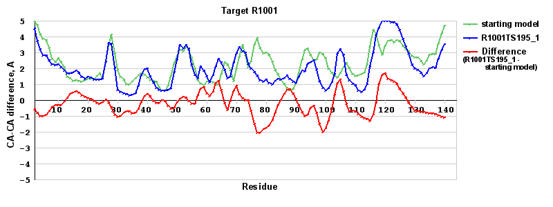 | Red line = (blue line) - (green thick line): difference between the corresponding Refined Model-Target and Starting Model-Target CA-CA distances (see above). Negative values show regions where the reifned model has better fit to the target than the starting model, i.e. areas of potential improvement. |
