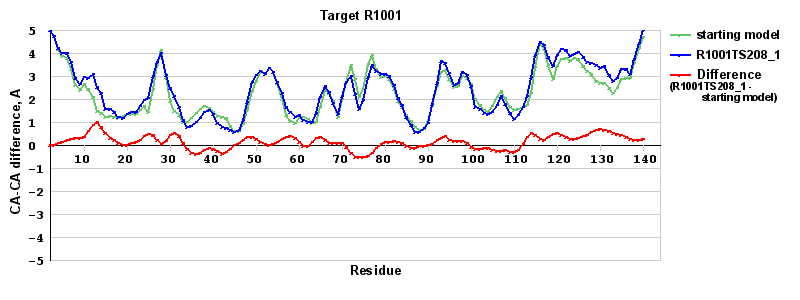 | Red line = (blue line) - (green thick line): difference between the corresponding Refined Model-Target and Starting Model-Target CA-CA distances (see above). Negative values show regions where the reifned model has better fit to the target than the starting model, i.e. areas of potential improvement. |