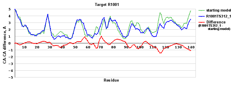 | Red line = (blue line) - (green thick line): difference between the corresponding Refined Model-Target and Starting Model-Target CA-CA distances (see above). Negative values show regions where the reifned model has better fit to the target than the starting model, i.e. areas of potential improvement. |