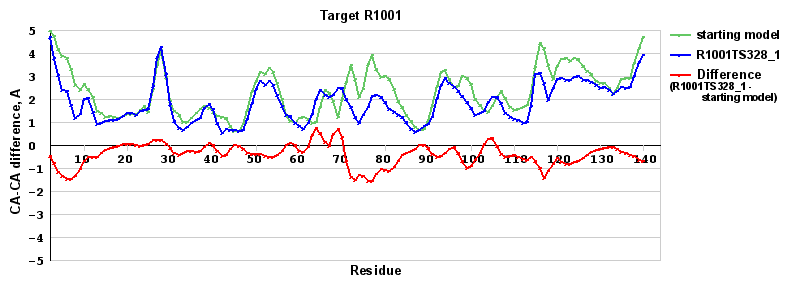 | Red line = (blue line) - (green thick line): difference between the corresponding Refined Model-Target and Starting Model-Target CA-CA distances (see above). Negative values show regions where the reifned model has better fit to the target than the starting model, i.e. areas of potential improvement. |
