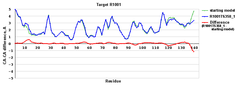 | Red line = (blue line) - (green thick line): difference between the corresponding Refined Model-Target and Starting Model-Target CA-CA distances (see above). Negative values show regions where the reifned model has better fit to the target than the starting model, i.e. areas of potential improvement. |
