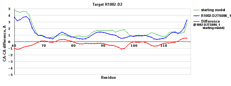 | Red line = (blue line) - (green thick line): difference between the corresponding Refined Model-Target and Starting Model-Target CA-CA distances (see above). Negative values show regions where the reifned model has better fit to the target than the starting model, i.e. areas of potential improvement. |