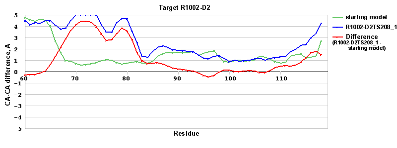 | Red line = (blue line) - (green thick line): difference between the corresponding Refined Model-Target and Starting Model-Target CA-CA distances (see above). Negative values show regions where the reifned model has better fit to the target than the starting model, i.e. areas of potential improvement. |