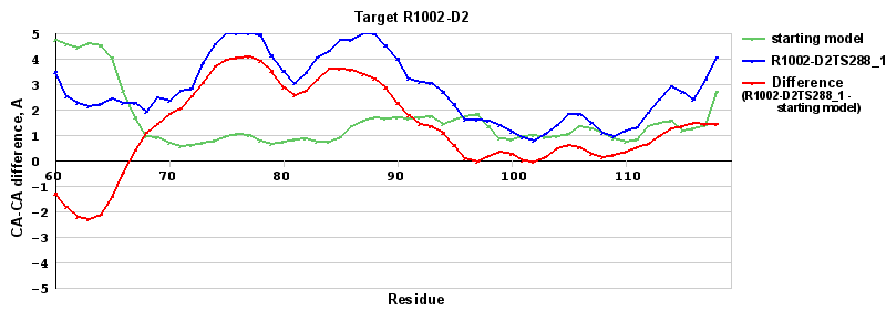 | Red line = (blue line) - (green thick line): difference between the corresponding Refined Model-Target and Starting Model-Target CA-CA distances (see above). Negative values show regions where the reifned model has better fit to the target than the starting model, i.e. areas of potential improvement. |