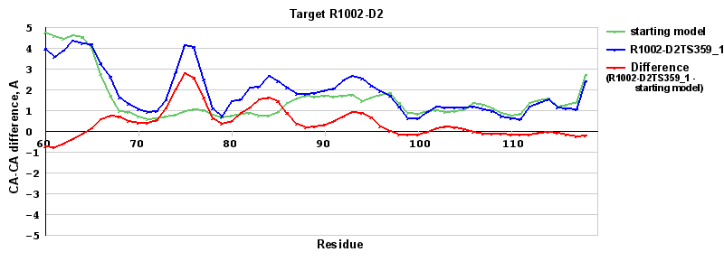 | Red line = (blue line) - (green thick line): difference between the corresponding Refined Model-Target and Starting Model-Target CA-CA distances (see above). Negative values show regions where the reifned model has better fit to the target than the starting model, i.e. areas of potential improvement. |