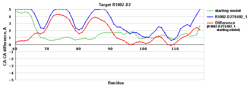 | Red line = (blue line) - (green thick line): difference between the corresponding Refined Model-Target and Starting Model-Target CA-CA distances (see above). Negative values show regions where the reifned model has better fit to the target than the starting model, i.e. areas of potential improvement. |