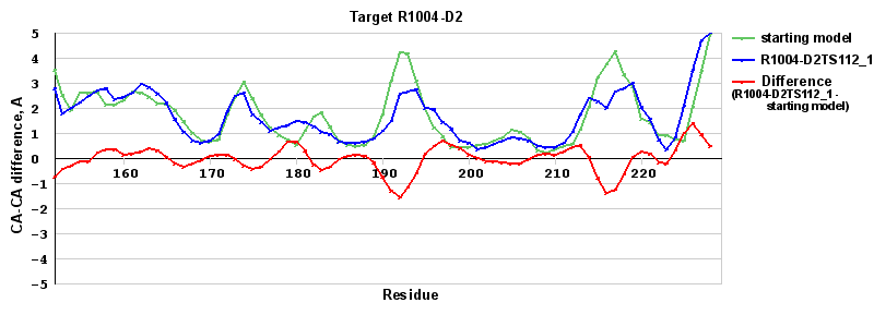 | Red line = (blue line) - (green thick line): difference between the corresponding Refined Model-Target and Starting Model-Target CA-CA distances (see above). Negative values show regions where the reifned model has better fit to the target than the starting model, i.e. areas of potential improvement. |