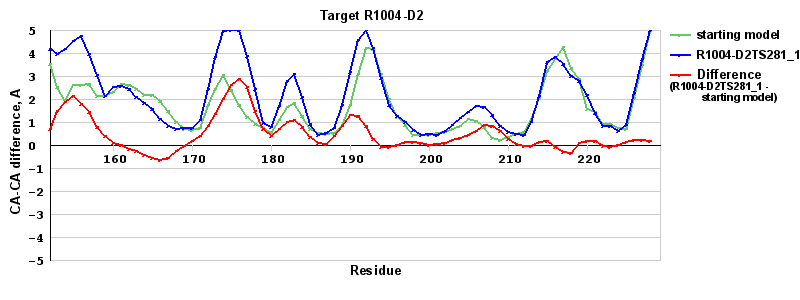 | Red line = (blue line) - (green thick line): difference between the corresponding Refined Model-Target and Starting Model-Target CA-CA distances (see above). Negative values show regions where the reifned model has better fit to the target than the starting model, i.e. areas of potential improvement. |