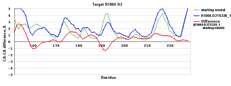| Red line = (blue line) - (green thick line): difference between the corresponding Refined Model-Target and Starting Model-Target CA-CA distances (see above). Negative values show regions where the reifned model has better fit to the target than the starting model, i.e. areas of potential improvement. |