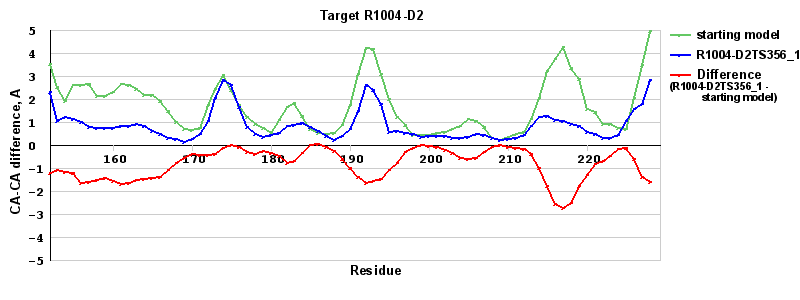 | Red line = (blue line) - (green thick line): difference between the corresponding Refined Model-Target and Starting Model-Target CA-CA distances (see above). Negative values show regions where the reifned model has better fit to the target than the starting model, i.e. areas of potential improvement. |