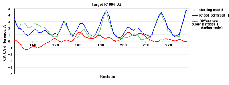 | Red line = (blue line) - (green thick line): difference between the corresponding Refined Model-Target and Starting Model-Target CA-CA distances (see above). Negative values show regions where the reifned model has better fit to the target than the starting model, i.e. areas of potential improvement. |
